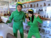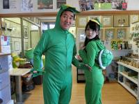 カッパに変身すべく静岡かっぱ村のはんてんを飯尾さんに着せてあげる館長